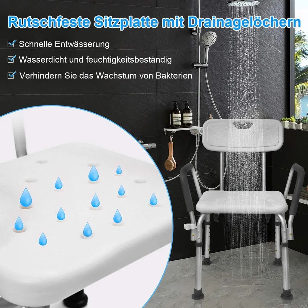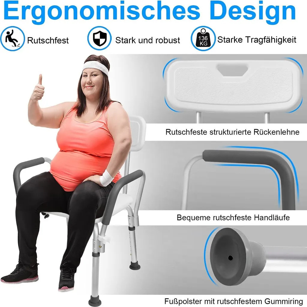 Praktická židle do sprchy pro seniory, těhotné ženy a osoby s omezenou pohyblivostí. Poskytuje bezpečí, pohodlí a stabilitu při sprchování nebo koupeli.